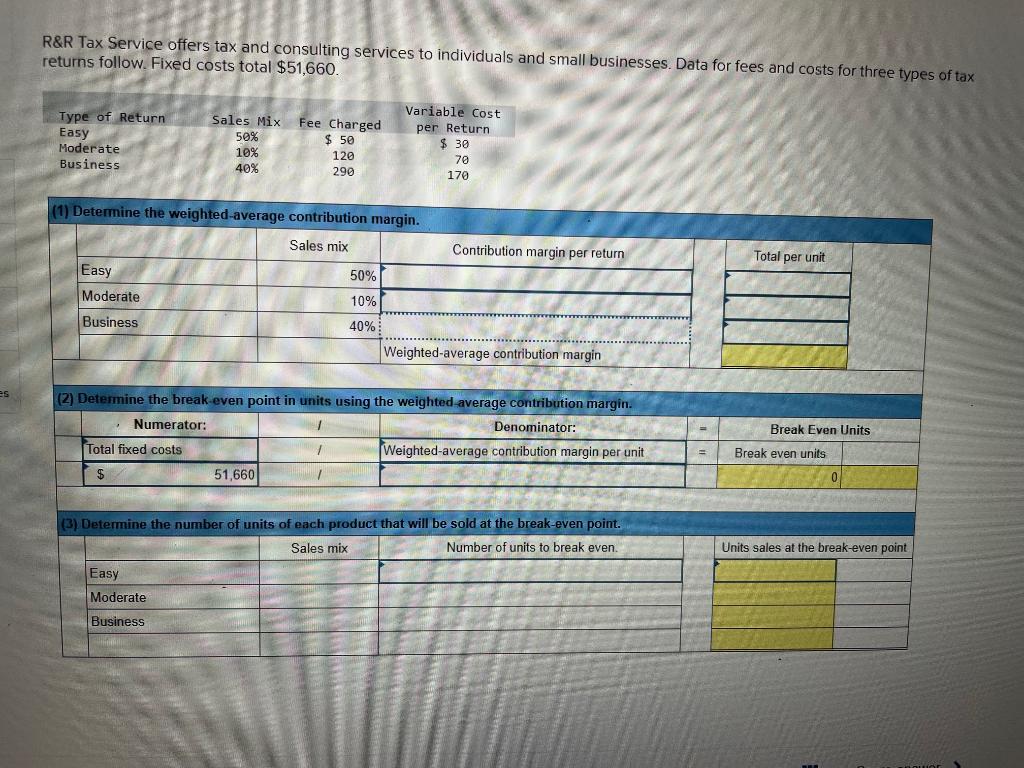 Ad Instantly Download or Print All of the Required Tax Preparation Services Forms Start Now. Fixed costs total 39680. Variable cost type of return easy moderate business sales mix fee charged 50 125 275 per return 30 50 30 20 75 100.
